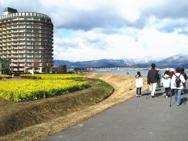 歩き出してすぐ今回のイベントの一つ目のお目当て、菜の花畑を左手に見てウォーキング。