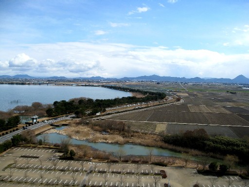 琵琶湖大橋を渡っている間はさっきまでの青空は姿を消し、雪がこんこん降っていたのですが、渡り終えた途端、元の青空が戻ってきました。